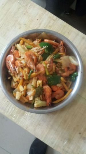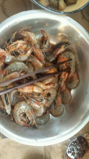 锅里留下少须油 放入陪菜 家里长用的调料适量放入配菜熟时放入少量白糖 在把青虾到近去 翻炒几下就ok了