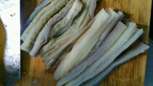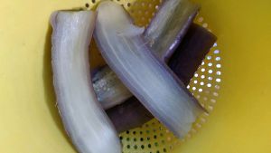 茄子捞起来,轻轻地撕掉茄子的表皮