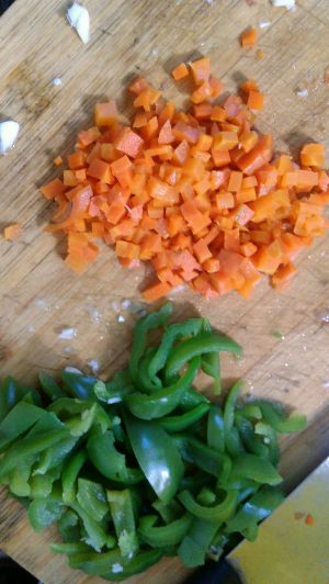 把煮好的胡萝卜青椒捞起来,胡萝卜切丁青椒切丝