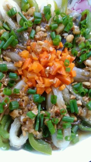 把做好得茄子装盘 泼上辣椒即可 放了酱油也可以不放盐 看宝宝们自己口胃