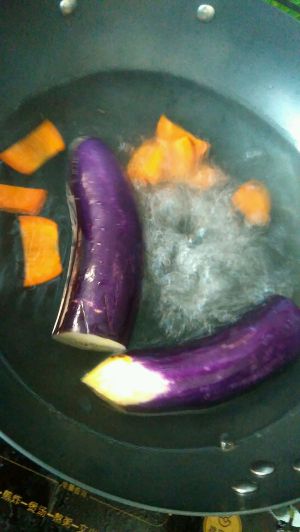 茄子洗净对切,胡萝卜洗净切片,然后一齐倒入滚烫的开水中煮