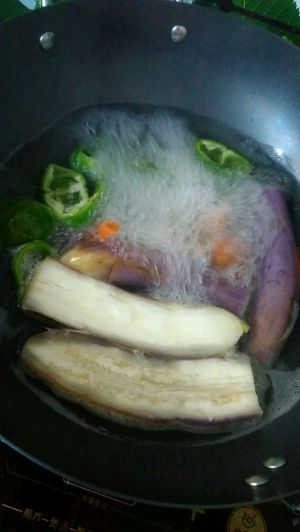 青椒不适宜煮太久否则容易变黄,所以茄子胡萝卜先煮一会,青椒后面再倒下去煮