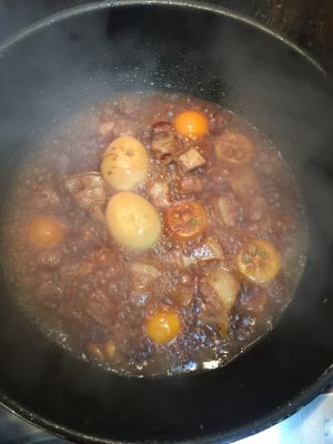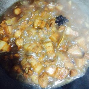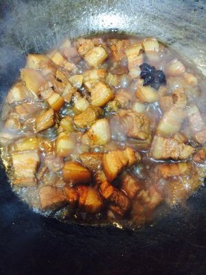 很快就开了,这时候简单翻炒一二下避免粘锅,加入几滴醋(分解蛋白质 让肉更肥而不腻),把泡着的八角也放入,立即搅拌下盖锅,转到小火,手机设定30分钟倒计时,时间到后再翻炒一下避免粘锅顺便检查水量,避免水少了糊了,再次盖锅还是继续小火,设定10分钟倒计时,然后时间到后大火收汁!放鸡精,不用放盐!继续翻炒收汁!感觉到汁水快没了粘稠了即可装盘!