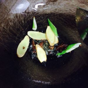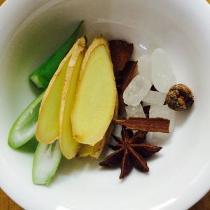 温油下佐料,把糖炒化,其他香料炒出香味。