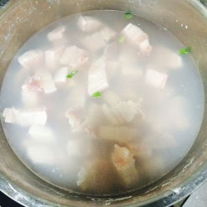 肉块倒入锅中,放入冷水淹没肉块,此时加入2勺料酒,然后烧开,切勿烧开热水后倒入肉块!热水烧开后取锅盖等1分钟后取出放在盘子里 沥干水!