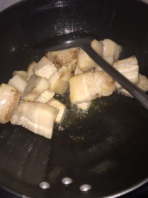 把五花肉放料酒生姜过水,切麻将块放入锅中小火慢炒,把多余的油炒出来。