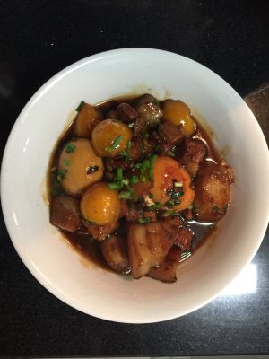 没来得及拍照。放肉煸炒至金黄色,然后烹少许料酒,煸炒二十秒左右放酱油炒上色,之后倒水