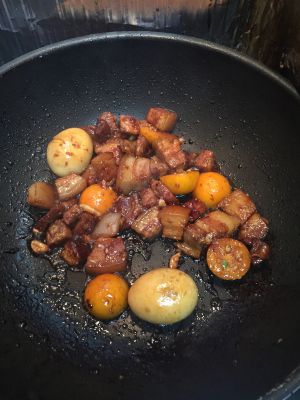 冰糖化好以后将肉和配料一起放入锅中翻炒至金黄色