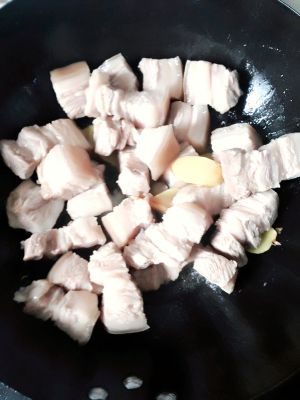 将五花肉切块儿.放入清水中过水. 放入姜片料酒