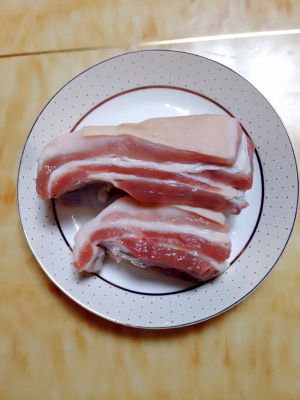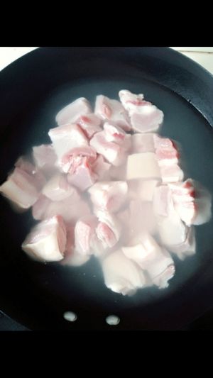 切好的五花肉放水里煮,煮开后再煮两分钟,然后把五花肉捞出备用
