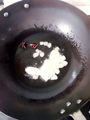 把锅里放少量油然后把姜、八角、冰糖放油里炒出香味,放入五花肉