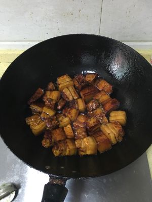 2、锅中放少量植物油,烧热,将肉丁投入锅内翻炒,直至出油略干,加入葱节,姜片、八角 、酱油、香醋、白糖各适量翻炒,再加入适量清水(没过肉丁),大火烧开后,改中火继续烧至汤汁余少许时,装盘。