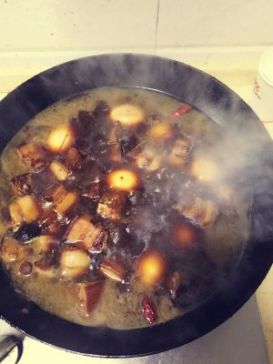 第二次煮肉汤一定一定要留着,加入肉汤,加入适量盐酱油黄酒,加入鸡蛋,可以加入两个小辣椒,大火煮开转小火慢慢熬制,收汁