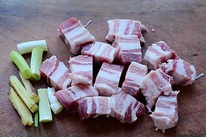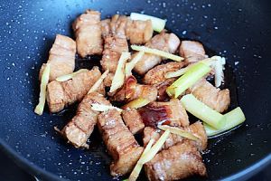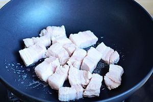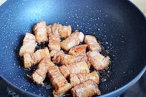 锅里放油,将五花肉放入,小火煸炒,煸炒出肥油
