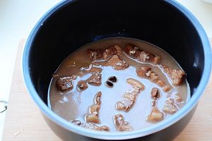肉清洗干净切大块丁,摩飞多功能电火锅中加入水,花椒,八角,香叶一片 料酒。肉丁焯水去沫备用。
