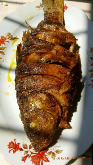 将玛好味的鱼抹上豆粉,备用。架锅放油,烧至5成热,慢慢炸鱼,把鱼炸稣,防止鱼型炸坏。火不易过大,也别把鱼炸糊。炸好后鱼如图。