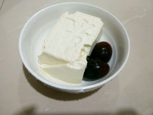 从盒子里倒出内脂豆腐放入盘中切成一小块一小块的