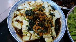 一盒绢豆腐,用刀把四周划到底保证豆腐和盒子分开,然后倒扣在盘子里,用刀横竖划成小块