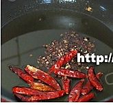 第二步锅里剩余的油,再次加入辣椒花椒(材料图中第四步材料),炸至稍稍变色出香味,全部浇在第三步鱼碗里即可。
