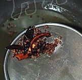 锅里热大约150ml油,也可以稍微多加些,避免中间捞出调料时,油的损耗导致不够,而且,炸出的香油若剩余,用来炒菜或者凉拌菜味道都非常好。加入材料图中所示第二步的材料,小火慢炸10分钟至出香气,捞出调料不要,油在锅里备用。