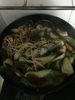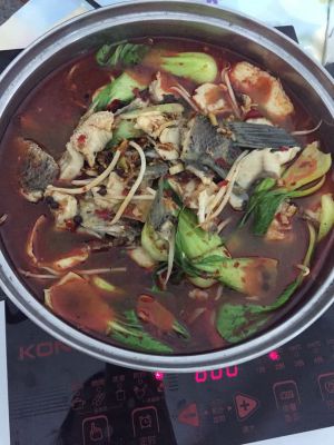 炒香底料后加入适量水大火煮沸,先放入鱼头,一分钟后加入鱼骨后加鱼肉,全部加入后放入油菜豆芽和干豆腐。稍开锅可放入电磁炉专用锅,冬天在家吃,边吃边咕嘟~热乎乎滴!