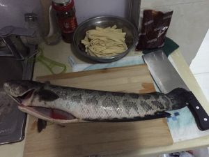将活鱼收拾干净,注意:改刀用时较多,粘液较多,整理时带手套以免伤到自己。将内脏~鱼泡都摘净。将鱼肉斜刀切片,鱼骨部分剁块,鱼头留用。