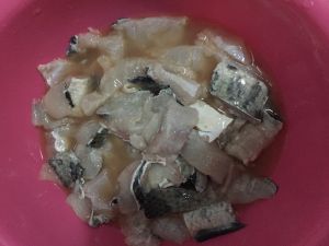 将切下的鱼肉鱼骨鱼头用料酒、姜片、淀粉和盐抓匀备用。