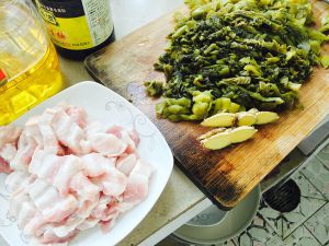 将酸菜先浸泡大约半个小时,去吃部分的盐味和酸味。之后切切碎(不要太碎,酸菜鱼里那种就差不多) 五花肉切块,生姜切块。