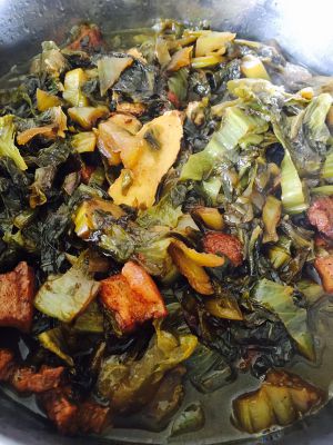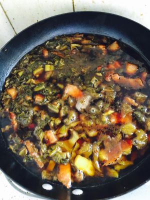 下姜片,八角,小米椒,老抽继续翻炒片刻,加入酸菜,翻炒,加入水和糖。(谁要没过菜)