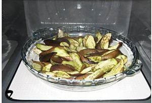 茄子切成条,放进微波炉加热8分钟。