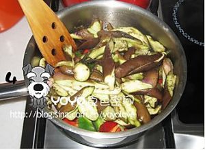 倒入炸好的茄子继续翻炒