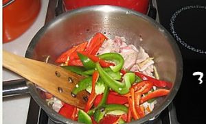 热锅热油爆香1勺蒜末,加入肉片翻炒至变色,加入辣椒。