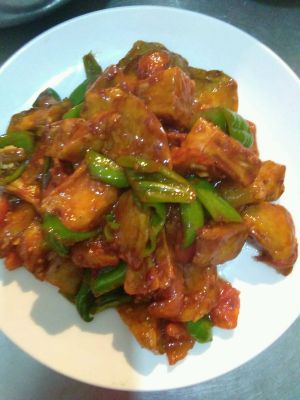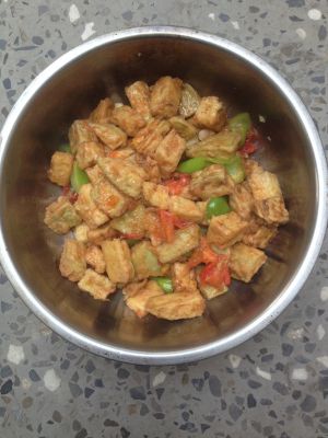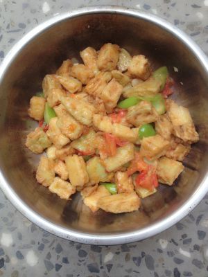 另起锅放底油,下豆瓣番茄酱蒜末出颜色,下青椒块西红柿块炒匀加水,调味,倒入炸好的茄子,翻炒均匀淋明油出锅。