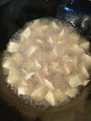 油烧热把茄子炸成金黄色捞出。锅里剩点油烧热加姜蒜爆香。