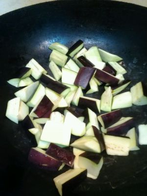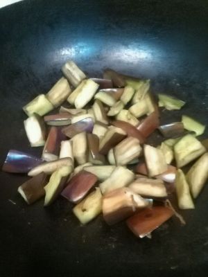 导入腌好的茄子,不断翻炒,让每个茄子块都上色,微微发黄