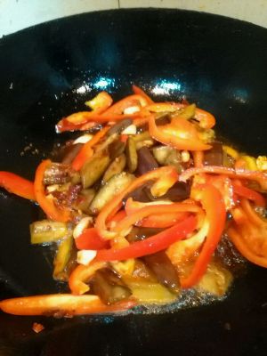 下油,热锅,炒豆瓣酱+大蒜+茄子+青椒,旺火翻炒2分钟,后加盐,鸡精,味精食量哦,解放天性的炒完熟了,香气四溢,完成。