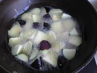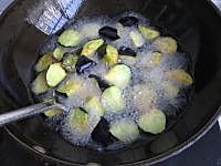 第六步:锅内放入适量的油,油温五六成热的时候,放入茄子开始煎炸。