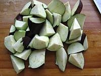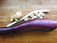 第二步:将茄子去皮切块、青辣椒切块、蒜切末备用。