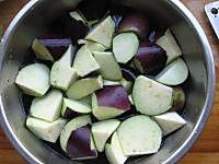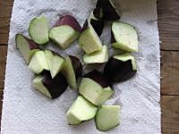 茄子滚刀块切好,加少许盐腌制,10分钟左右把腌制好的茄子挤干水分。待用。