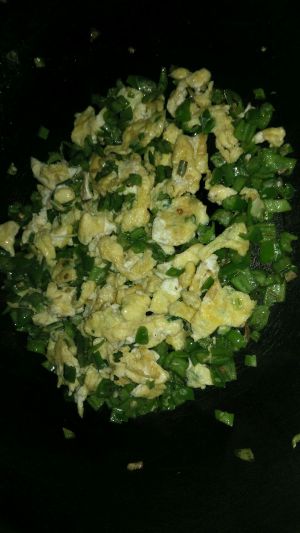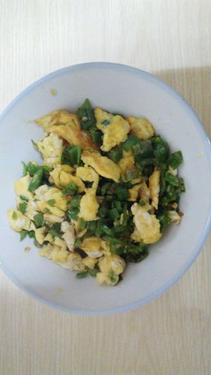 利用锅里的余油,蒜末煸油,倒入青椒翻炒,加入少量盐、水,待青椒变软后,加煎好的鸡蛋继续翻炒1分钟即可出锅。