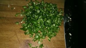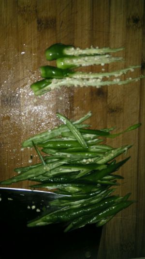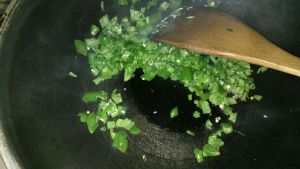 空锅倒入青椒碎,干炒到表面颜色发黄绿色,半熟的样子