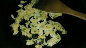 油锅热后,将火稍微调小一些,倒入打散的鸡蛋液,摊开,待边缘变酥卷起时,可翻一面煎。煎到微焦黄后,用锅铲把蛋分成若干小块装盘。