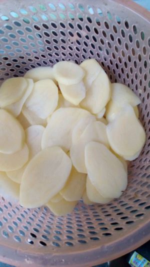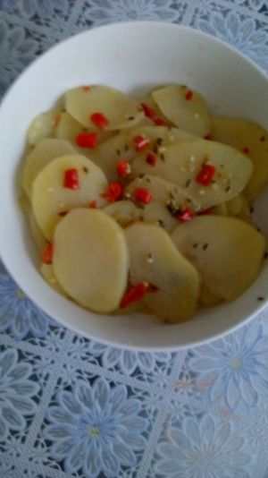 土豆削皮,切薄片。泡盐水(也可不泡)两勺盐用来泡盐水,如省略这步的,盐丢到第二步佐料里。