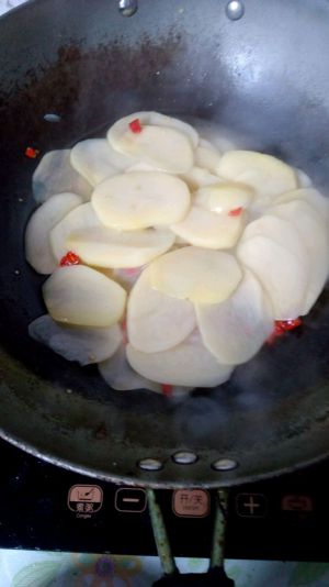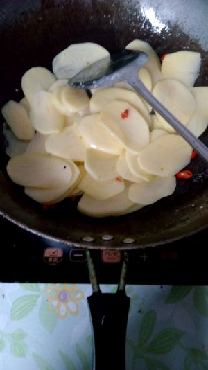 放入土豆片,翻炒,加入孜然。