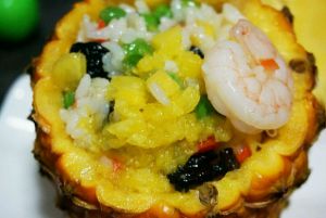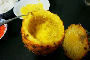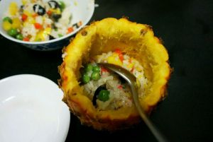 将所有食材连同米饭放入锅里一起炒,先放鸡蛋和肉馅,菠萝最后放,其它食材都熟了在放菠萝,翻炒出锅,炒久了会烂。然后装在挖好的菠萝壳子里。