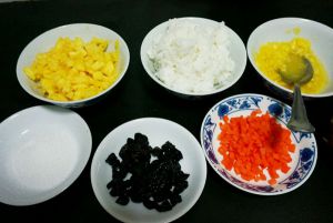准备其他食材。菠萝丁和米饭里分别拌入白砂糖。