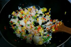 依次放入豌豆,黑加仑干,菠萝丁,虾仁,翻炒半分钟左右,放入米饭,炒匀。