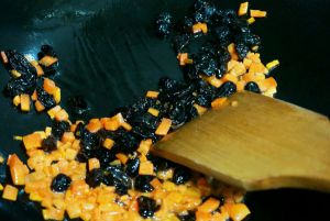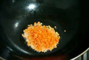 锅中放入少于食用油,放入胡萝卜丁翻炒半分钟左右