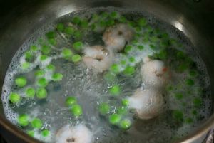 锅中放入水(水不用太多),烧开后放入豌豆和一勺白砂糖,煮5分钟后放入泡好的虾仁,一分钟后一起捞出。