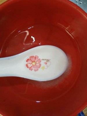 一勺糖,两勺醋(家里没有陈醋了,暂时用白醋代替也是可以的)三勺水搅拌均匀。